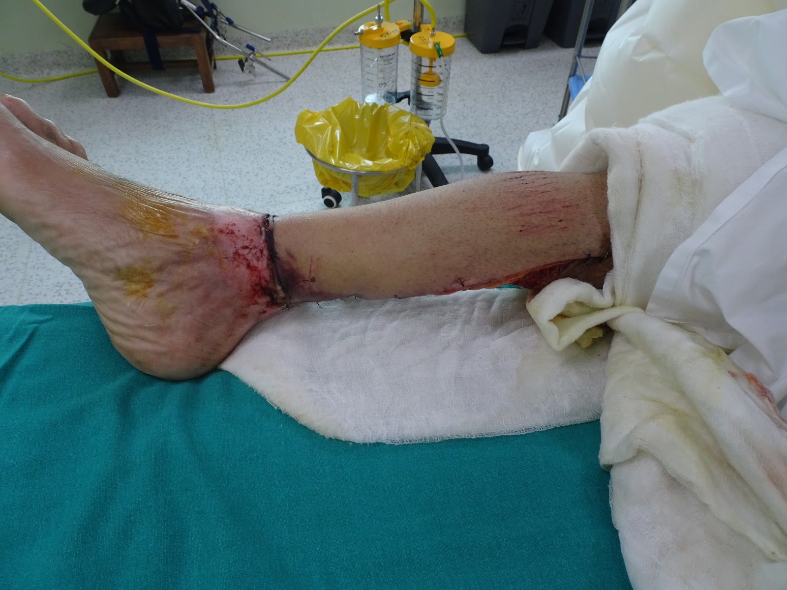 ALT flap of dimension 15 by 15 cm was dissected out and transferred to leg .flap was insetted ,flap artery was anastomosed to end to side to posterior tibial vessels . Both veins were anastomosed , one to saphenous vein and other to veinae comitant . After 5 days patient was again taken up and skin grafting was done. Next day patient was discharged.